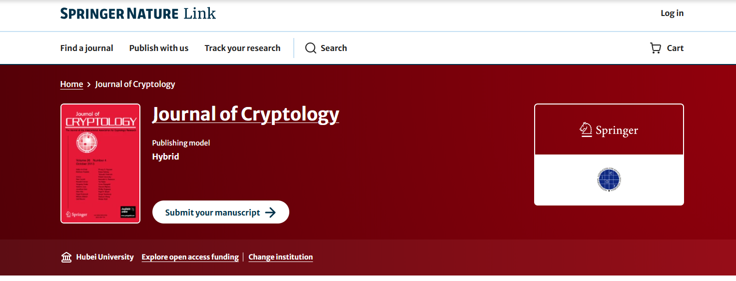 近日,我院密码学团队涂自然、曾祥勇、李念三位教授和挪威卑尔根大学Chunlei Li教授、挪威科学院院士Tor Helleseth教授,在《Journal of Cryptology》(JoC)联合发表科研论文《New Characterizations of Dillon-like Hyperbent Functions via Dickson Polynomials》。这是湖北学者首次在JoC发表论文,湖北大学为第一单位,涂自然教授为第一作者,曾祥勇教授为通讯作者。