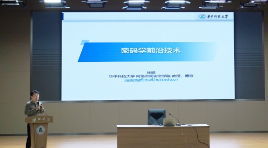 第一阶段:在学校双创大楼三楼报告厅,徐教授做了一场关于《密码学前沿技术》的主题报告。首先从如何理解“安全”出发引出问题,介绍了现代密码学为什么安全,指出密码是保障网络与信息安全最有效、最可靠、最经济的手段。然后,由于恶意攻击者的威胁和计算/存储/网络环境的不可信,如何通过对前沿应用密码技术保障数据采集、传输、存储、处理、交换、销毁全生命周期安全。
